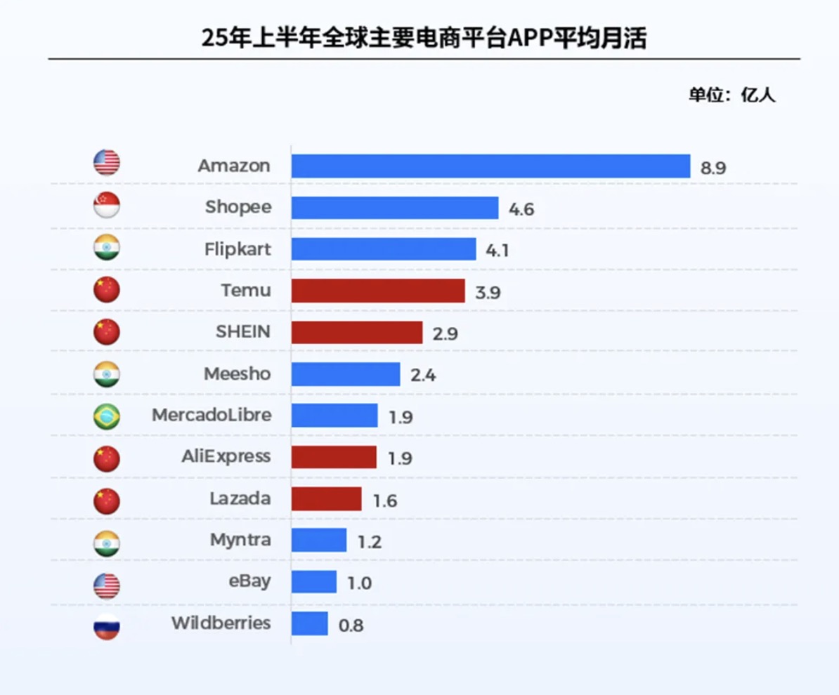 Amazon以全球8.9亿月活用户保持绝对领先,其全球布局、完善的物流体系及高客单价的品牌优势,使其持续占据成熟市场核心地位。区域型平台表现突出,东南亚的Shopee凭借高度本土化运营和社交化体验稳居第二,而印度市场的Flipkart则展现出区域深耕的竞争力。