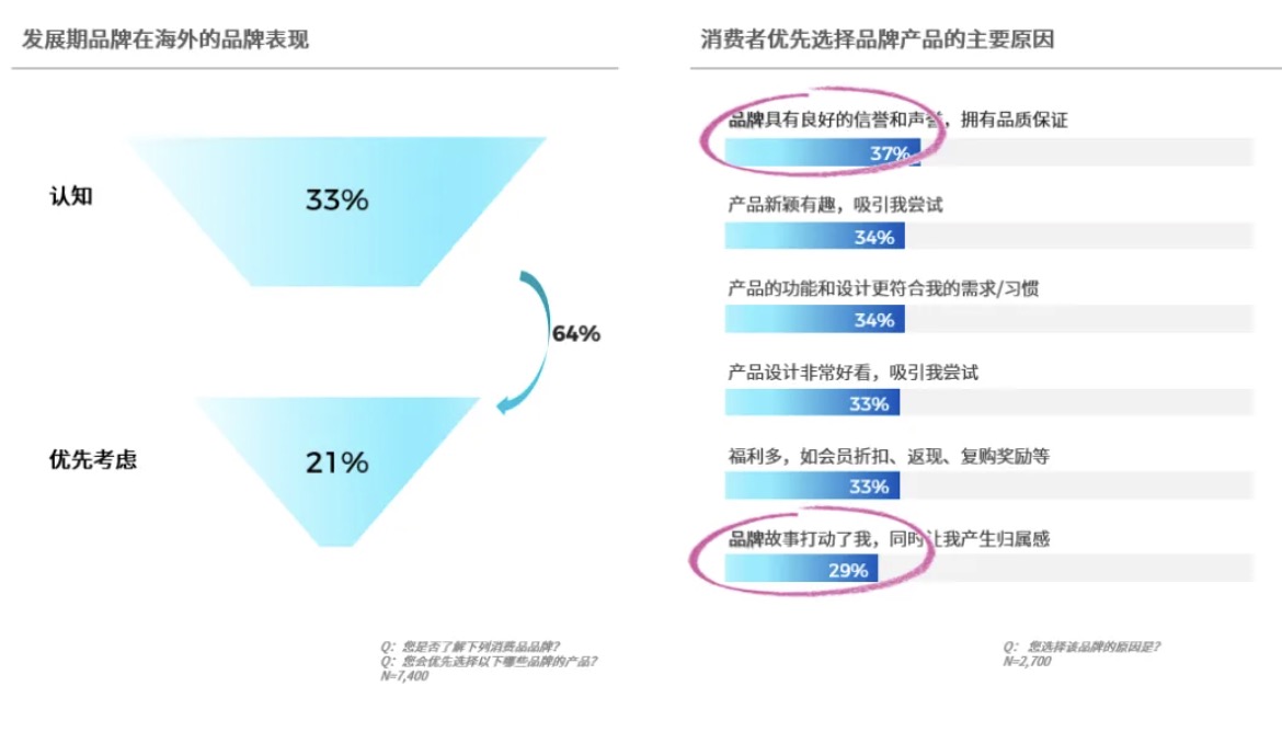 根据飞书深诺发布的《2024 MeetBrands中国出海新锐消费品牌榜单报告》显示,全球近1/3消费者认知中国发展期标杆企业(年海外营收1千万~1亿美元且增速超10%)。且这些企业正通过品牌声誉与故事驱动消费决策,标志着其正逐步从产品营销跃迁至品牌建设。