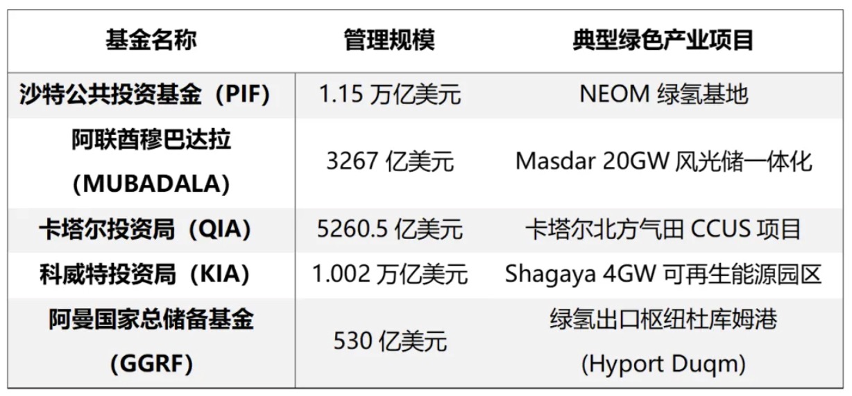 除了规划引导,海合会国家的主权财富基金也在可再生能源领域发挥着重要作用。据统计,海合会国家主权财富基金的总规模约达4.4万亿美元,相当于全球100家最大主权财富基金总资产的34%4。这些主权基金凭借雄厚的资金实力,积极投资国内外绿色产业项目,通过精准布局推动转型(见表2)。