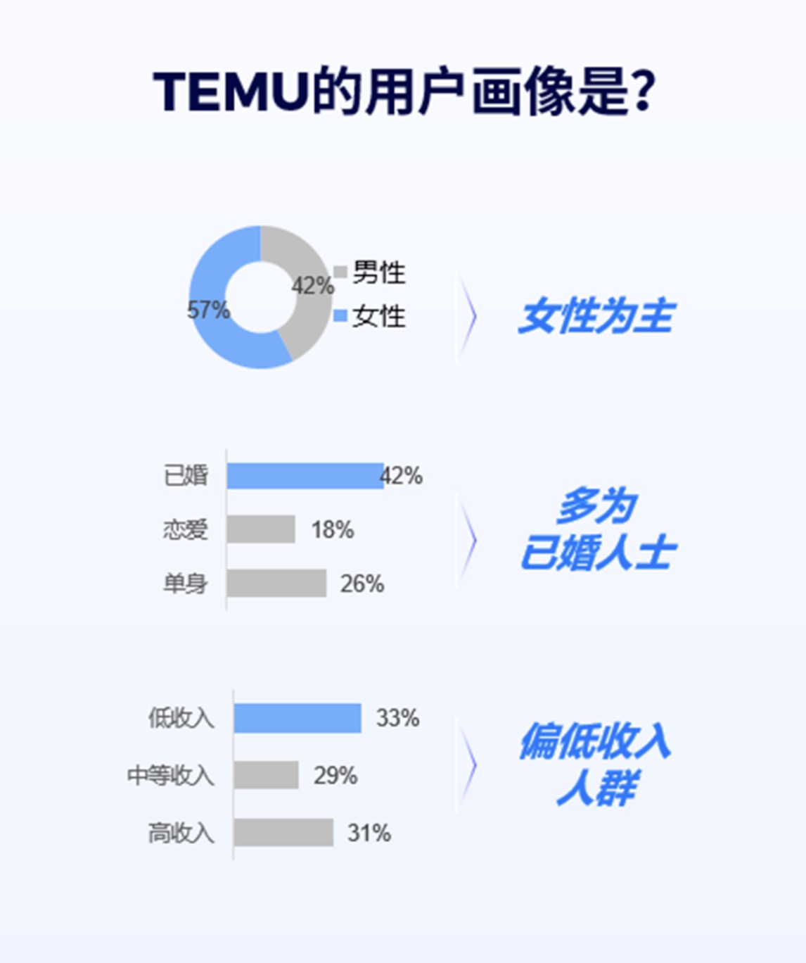 TEMU凭借其平台特性,精准吸引了以女性、已婚有孩家庭为主的价格敏感型用户。中低收入家庭构成其核心客群,同时平台也逐步渗透至高收入群体,成为后者采购日用品和季节性商品的补充渠道。
